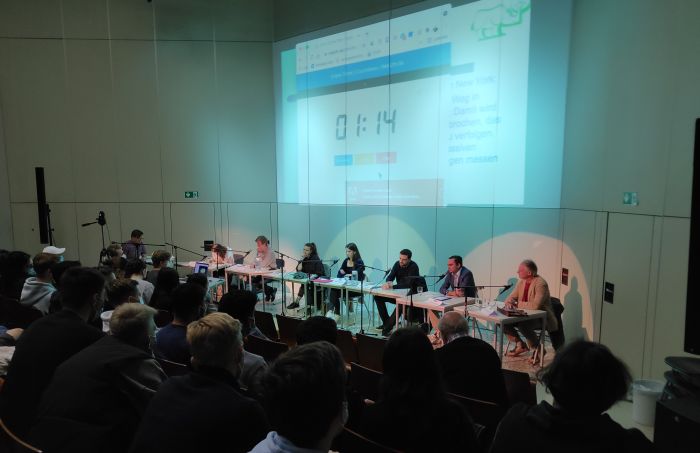 Herr Jetter moderierte die Veranstaltung. Herr Allwardt, Ben Löschenkohl, Thorben Riedel und Lenno Hannig von der SV Unity sortierten die vielen Fragen, die aus dem IServ-Chat kamen. Neben drei Profilen des 13. Jahrganges, die im Hörsaal die Diskussion verfolgten, hatten nämlich auch die 17 (!) Klassen und Profile, die der Diskussion im Live-Stream über IServ folgten, die Möglichkeit, die Politiker*innen über die Chat-Funktion zu ihren Klimaschutzprogrammen zu befragen.