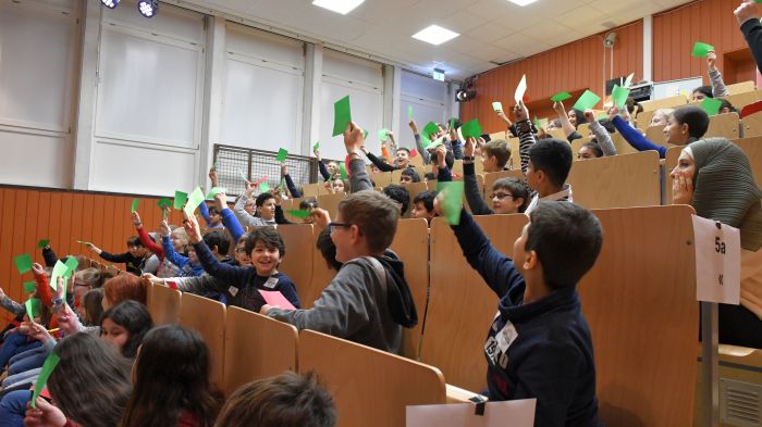 Die gut 70 jungen Menschen hatten zum Auftakt zunächst gemeinsam geübt, was ein Parlament können sollte: Zuhören, abstimmen mit grünen und roten Karten, still sein, Ablehnung zeigen, gemeinsam Forderungen aussprechen (mehr oder weniger im Chor), Fragen stellen. Diese sollten dann in einer Projektwoche künstlerisch sichtbar gemacht werden.