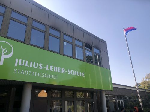 Am 22.4.22 gab es die Eröffnungsfeier - mit Besuch von Nachbarschulen und sogar aus Nordrhein-Westfalen. Das Siegel "Schule ohne Rassismus - Schule mit Courage" existiert an der Schule schon länger, "aber Sichtbarkeit für queere Jugendliche ist unheimlich wichtig", so Diversitätsbeauftragter Frank Thies. "Diskriminierung steht leider immer noch auf der Tagesordnung im Schulalltag, doch die Peer-to-Peer-Projekte soorum und Plietsch, eine Queer-AG, Plakate, Flaggenhissungen, Durchsagen zu Vielfaltstagen und mehr sorgen für Bewegung."